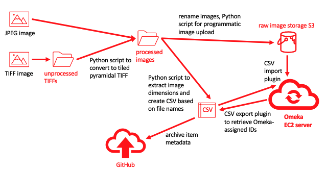 The workflow described here is based on assembling the metadata in the most automated way possible, using file naming conventions, a Python script, and programatically created CSV files. Python scripts are also used to upload the files to S3, and from there they can be automatically imported into Omeka.